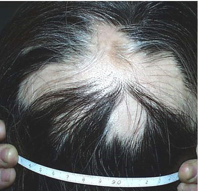 头发不明原因大量脱落、边界整齐、脱发区头皮光滑