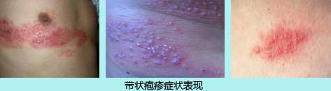 患处常首先出现潮红斑,很快出现粟粒至黄豆大小的丘疹,簇状分布而不融合,继之迅速变为水疱,疱壁紧张发亮,疱液澄清,外周绕以红晕,各簇水疱群间皮肤正常;皮损沿某一周围神经呈带状排列,多发生在身体的一侧,一般不超过正中线。