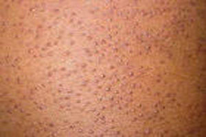 2、从外观上看,有针点般的小丘疹,散在性分布,粗糙,颜色呈肉色、红褐色、棕色或灰黑色,看起来很像“鸡皮疙瘩”,大部分的疹子均无痛痒症状。
