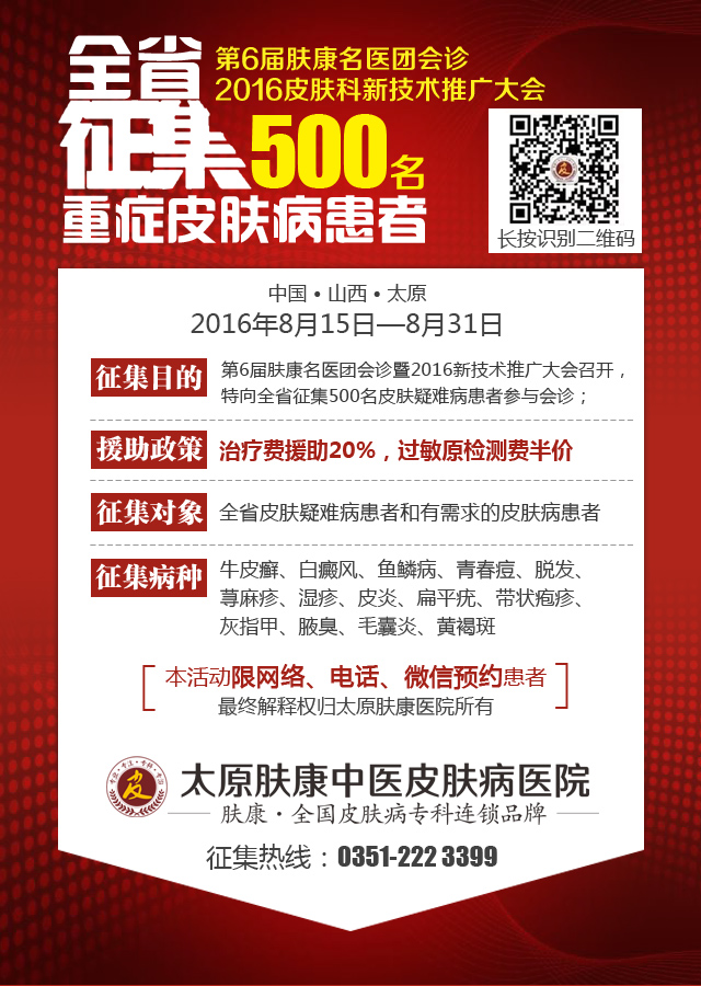 通过中华慈善总会,白求恩基金会提供皮肤病治疗援助基金,太原肤康中医皮肤病医院启动500名疑难重症患者征集活动,每人治疗费援助20%,并且针对过敏原检测,费用减免一半,医院留观床位费(包括VIP病房)全部免费!本次征集活动由8月15日开始至8月31日结束,仅限网络、微信预约响应征集的患者。