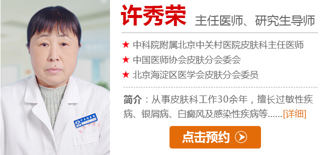 许秀荣教授毕业于首都医科大学医学系,曾在首都医科大学附属北京朝阳医院、北京大学第三医院及首都医科大学附属北京宣武医院皮肤科进修学习。现任职于中国正规院附属北京中关村医院皮肤科医生医师。