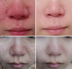 鼻尖及其两侧面颊出现丘疹、脓疱,毛细血管扩张更明显。