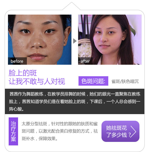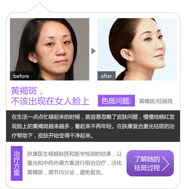 针对黄褐斑等顽固性色斑,以激光+中药调理综合祛斑,淡斑美白的同时,调理内分泌,内调外治有效攻克顽固斑。